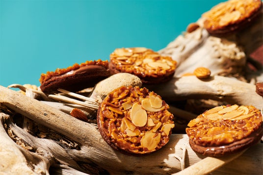 「アーモンドチュイル」「ジャンドゥーヤチョコレート」「シュトロイゼル」を3層に重ねた、進化系フロランタンです。薄型で軽めの口当たりからは想像できないような【ザクザク、トロトロ、パリパリ】といった食感をお楽しみいただけます。フロランタンの常識を超えた、新しいスイーツ体験をお楽しみください。