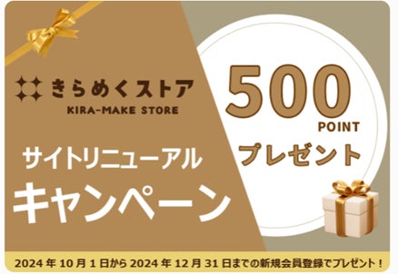サイトリニューアルを記念して、2024年10月1日~2024年12月31日までの間、「きらめくストア」で新規会員登録いただいたお客さまに、きらめくストアで使えるポイント500ポイント※3をプレゼントいたします。