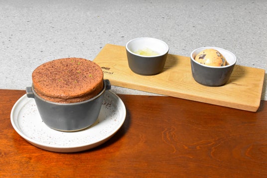 アツアツのスフレを一口頬張ると、カカオ由来のナッツのようなコクのあるチョコレートの濃厚な風味が口の中いっぱいに広がります。食べ進めると、底にりんごジャムとシャキシャキと食感のある刻んだりんごが現れ、チョコレートの濃厚な味わいに、爽やかなりんごの甘味と酸味が加わります。