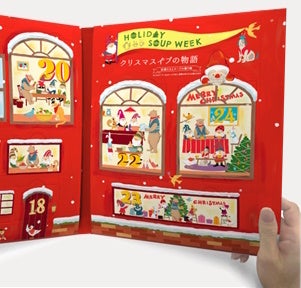 12月18日~12月24日までの日付が記された窓をあけると、スープの妖精たちが登場する、クリスマスにちなんだストーリーが描かれており、そのストーリーとリンクした品種のスープが入っています。絵本のようにお子様と一緒にお楽しみいただけます。