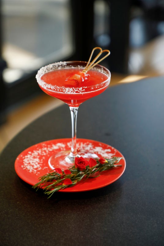 “大人の社交場”をテーマにした「ザ バー」では、旬の苺を使用した果実味溢れるシーズナルカクテル「ダージリンベリーロワイヤル」をご提供いたします。“紅茶のシャンパン”と称されるダージリン茶葉の紅茶リキュールをベースに、甘酸っぱい苺の果肉とエルダーフラワーシロップ、華やかなシャンパンで仕立てる一杯は、軽やかな酸味と自然の甘みが調和したフルーティーな味わいです。仕上げに、春の淡雪に見立てたココナッツパウダーをあしらいました。水盤に面した幻想的なバー空間にて、シャンパンの芳醇な香りと果実の余韻をお楽しみください。