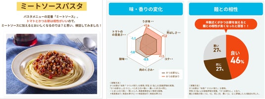 かつお節を加えるとうま味やコクが増し、肉の臭み、トマトの青臭さが軽減されることが分かりました。また、かつお節を加えることでミートソースと麺との相性がアップすることが明らかに。学生からは「味に深みが出た」、「汁気がかつお節によって少なくなるので麺と絡みやすくなり、かつお節の味をより感じる」という評価を得ることができました。