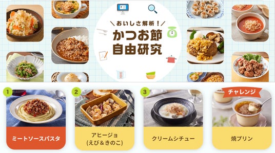 研究では、学生15名による官能評価を行い、かつお節を加えた際の味や香りの変化を徹底解析。また、「ミートソースパスタ」では麺との相性、「アヒージョ」や「クリームシチュー」ではバゲットやご飯といった主食との相性について、かつお節を加えることでどのような変化があるのか解析しました。サイトでは、かつお節の有無による味や香りの変化をイラストやグラフを用いてわかりやすくまとめている他、学生の感想や本田講師のコメント、各メニューのレシピも紹介しています。