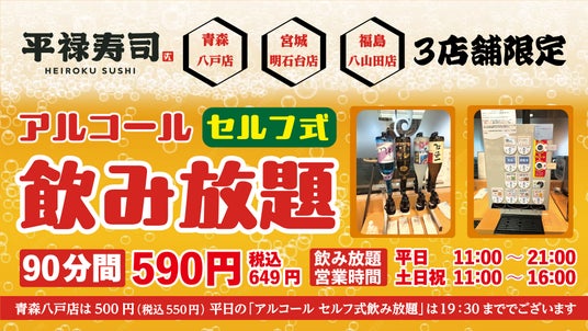 回転寿司のパイオニアとして1貫1貫、手握りのお寿司を提供し続けてきた「平禄寿司」では、青森八戸店、宮城富谷 明石台店、福島郡山 八山田店3店舗限定にて「アルコール セルフ式飲み放題」のサービスを実施しております。ビール、ハイボール、日本酒など、ご自身で注がれて、心ゆくまで90分間、お楽しみいただけます。忘年会、新年会を迎える宴会シーズンにも是非、ご利用ください。皆さまのご来店をスタッフ一同お待ちしております。