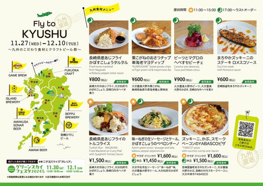 ソラシドエアが就航している3県(宮崎県・長崎県・大分県)から8自治体の食材があつまり、九州地方のクラフトビールとともに「Fly to KYUSHU ~九州のこだわり食材とクラフトビール祭~」と題して、料理提供を行います(詳細メニューは別紙をご覧ください)。また使用食材は、2024年11月30日(土)・12月1日(日)に開催される「ソラシドエア Presentsグリーンスカイフェスタ2024」の一部の自治体ブースで購入いただけます。