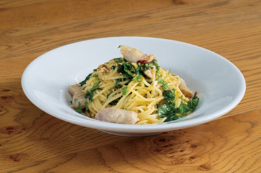 味一ねぎの生ソーセージとケール、かぼすこしょうのペペロンチーノ