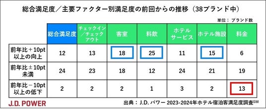 しかし、料金上昇が満足度全体に与える影響は限定的であった。前回調査では宿泊料金の大幅な上昇が主因となり、総合的な宿泊客満足度が大きく低下したが、今回調査では38ブランド中12ブランドで10pt以上の満足度向上が見られ、10pt以上低下したのは2ブランドのみだった。