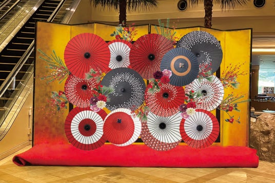 どなたでもご参加いただける1階ロビーイベントとして、鏡開き・振舞い酒、東海地方で活躍する宴組による祝い餅つき(実演)・振舞い餅を開催。和傘を使用したロビー装飾を眺めながら、お正月ならではのイベントをどうぞお愉しみください。