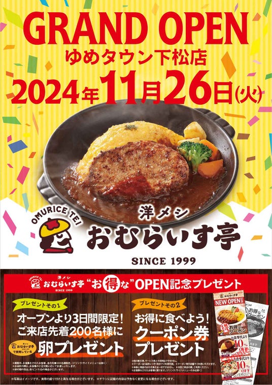 こだわりの「卵」を職人の手仕事で調理し、「卵」そのものの美味しさを丁寧に引き立てる“ふわトロ” オムライスの「おむらいす亭」山口ゆめタウン下松店が11月26日(火)にグランドオープンいたします。西日本を中心に32店舗を展開し、山口県内では5店舗目となります。そして、今回はオープン特別記念プレゼントを2種類ご用意しております。「おむらいす亭の卵」と「お得なクーポン券」でございます。(プレゼントのお渡しには条件がございます。下記に記載をさせていただきます。)どうぞ、この機会に「おむらいす亭」の美味しさをご堪能ください。真心を込めた調理、サービスで地域の方に末永く愛される店舗を目指しております。皆様のご来店をスタッフ一同お待ちしております。何卒よろしくお願い申し上げます。