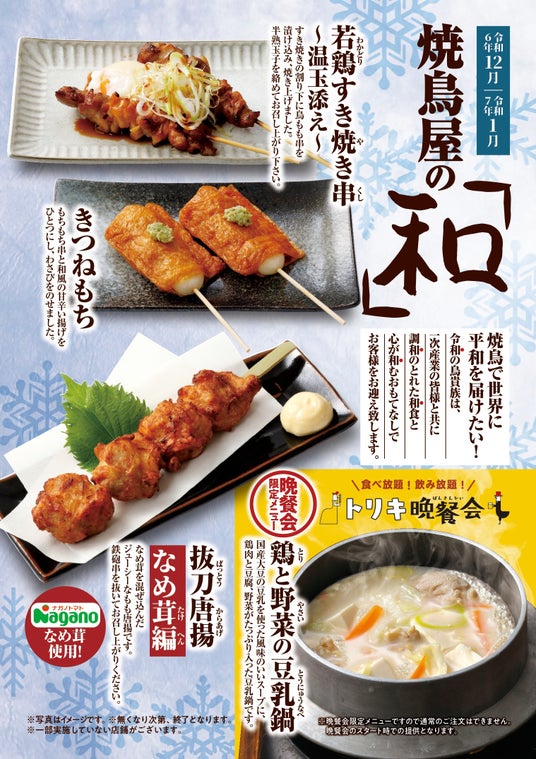 株式会社エターナルホスピタリティグループ傘下の株式会社鳥貴族(本社:大阪市中央区 代表取締役社長:江野澤暢男)が運営する税込370円均一の焼鳥屋「鳥貴族」は、12月1日(日)より、『焼鳥屋の和』第3弾として、鳥貴族初の鍋メニュー「鶏と野菜の豆乳鍋」や大人気シリーズ「抜刀唐揚(ばっとうからあげ)~なめ茸編~」など、期間限定メニュー全4品を販売いたします。