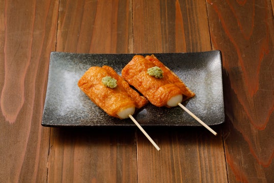 きつねもち和風に甘辛く味付けたお揚げで、鳥貴族で人気のもちもち串を包んだ逸品。わさびのツンとしたアクセントとともにお楽しみください。
