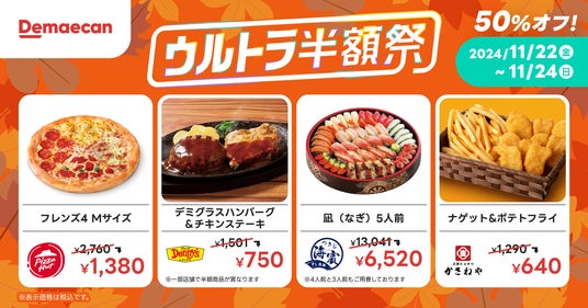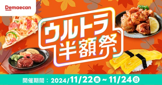 株式会社出前館は、運営する日本最大級のデリバリーサービス「出前館」において、対象商品が通常価格の50%OFFでご注文いただけるウルトラ半額祭を、2024年11月22日(金)~11月24日(日)の3日間限定で開催いたします。