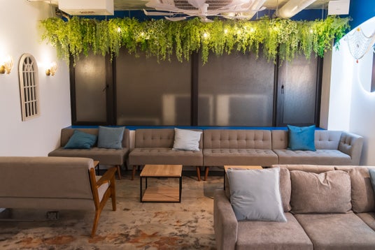 ・ インテリアと照明:ステンドグラス風のランプが柔らかい光を放ち、シンプルながらも洗練された空間を演出。温かみのあるソファやグリーン装飾も、心地よい雰囲気をさらに高めています。