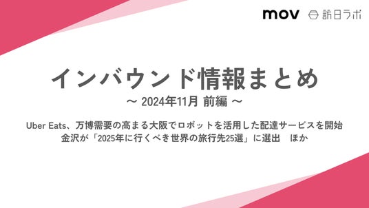 業界最大級のインバウンドビジネスメディア「訪日ラボ」及び 店舗向け集客一元化プラットフォーム「口コミコム」を運営する株式会社mov(代表取締役:渡邊 誠、本社:東京都渋谷区、以下mov)は、「インバウンドに関する最新トレンド・データ」「政府・自治体・企業などのインバウンド関連の取り組み」をはじめ、インバウンド対策に役立つニュースをまとめた「インバウンド情報まとめ【2024年11月前編】」を公開しました。