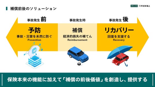 「補償前後のソリューション」とは、お客さまへの提供価値の変革に向け、保険本来の価値である「補償」だけでなく、事故・災害を未然に防ぐ「予防」、事故発生後の回復を支援する「リカバリー」に対応する商品・サービスです。それぞれのソリューションは、様々な社会課題の解決を目指して提供されています。