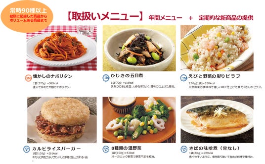 冷凍食品・調味料・健康補助食品・化粧品・テーブルウエア・調理器材などの企画販売、個人宅配事業、通販事業、法人向け社食サービス事業、海外事業、仙台ワークショップスペースなど