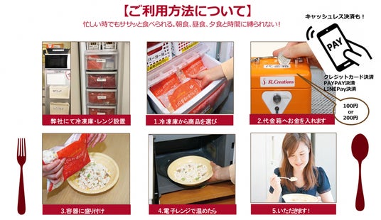 企業に冷凍庫・電子レンジを貸与し、SL Craetionsオリジナルブランドの米飯加工品やパスタ・中華麺、焼魚や煮込みハンバーグ、点心、煮物など惣菜メニューのほか、スープ、フルーツ、スイーツ、シリカ水など、約100種類の商品を社食として利用できるサービスです。