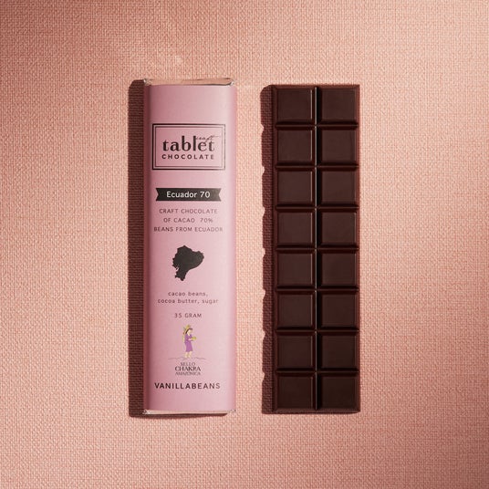 世界で約2%しか獲れない希少な「アリバカカオ種」を使用したカカオ70%のビターチョコレートです。酸味が少なく、コーヒーのようなまろやかさが特徴。VANILLABEANSがオーナーを務めるカカオ原産国支援プロジェクトのエクアドル共和国ナポ県アルチドナ地域の豆を使っており、現在はVANILLABEANSの売上金を積み立て、カカオ農家10名を対象に3,130本のカカオの木を植樹&栽培支援しています。商品価格:600円+税