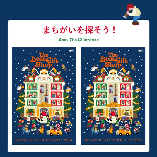 タブロイドの表紙と裏表紙は『まちがい探し』になっており、10個のまちがいが隠されています。まちがい探しのヒントはスペシャルサイト内で公開され、正解は12月25日(水)に同サイトで発表。さらに、『まちがい探し』クイズに参加すると、BEAMS CLUBのマイルとポイントがもらえるキャンペーンも実施します。