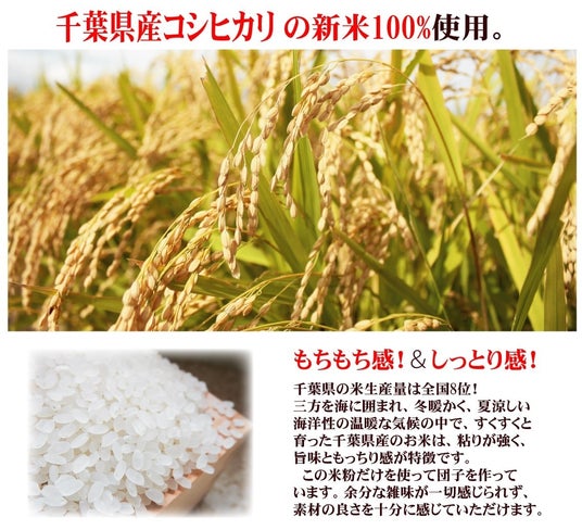 千葉県産コシヒカリを100%使用し、もち米などを一切使わず杵でついたお団子は