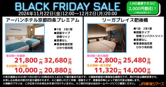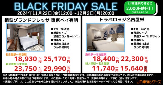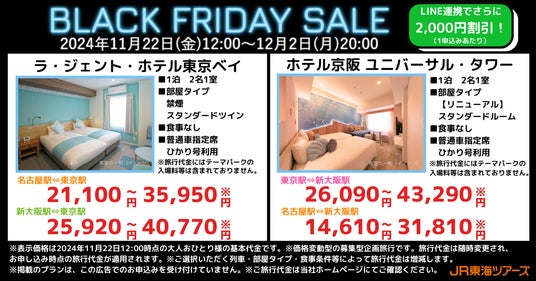 株式会社ジェイアール東海ツアーズ(本社:東京都中央区、以下JR東海ツアーズ)は、2024年11月22日(金)12時から12月2日(月)20時までの11日間、現在実施中のセール第2弾として「BLACK FRIDAY SALE」を開催いたします。第2弾では、変更が可能な往復新幹線と、コスパ重視のホテルや人気テーマパーク付近のホテルなど合計149施設から選べる宿がセットになった旅行商品を、期間限定の特別価格で販売いたします。さらにEX会員情報にLINEを連携すると、BLACK FRIDAY SALEプラン限定で利用できる2,000円割引クーポンを配信いたします。