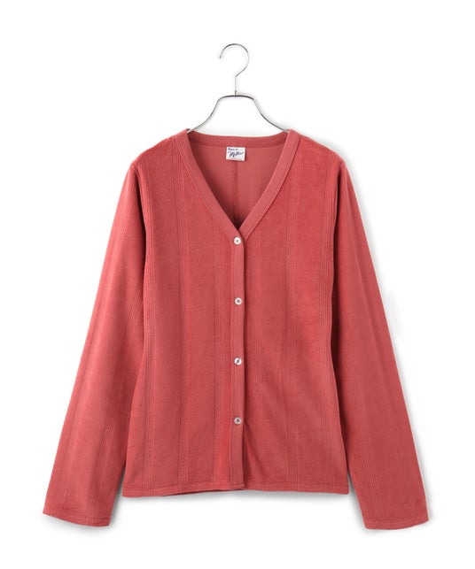 程よく肉感のある、柔らかい肌あたりのベロア素材を使用したカーディガン。