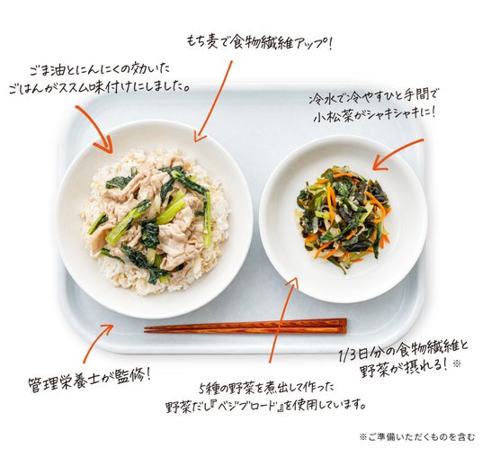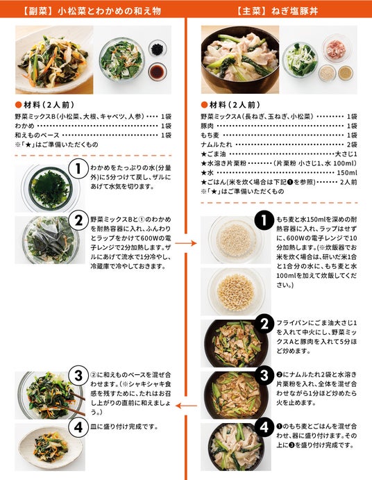 子どもたちの体も心も豊かに育む足立区の『おいしい給食』人気メニュー“ねぎ塩豚丼”がミールキットに。“小松菜とわかめの和え物”は食べる直前で和える足立区の給食のスタイルがおすすめです。