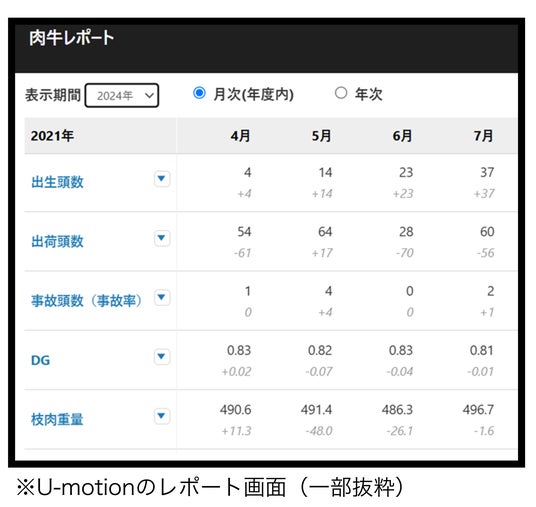 そこで、デザミスが提供するU-motionが課題解決のサポートをします。U-motionで事故頭数やデイリーゲイン(DG)など農家が注目すべき目標指標を数値化しレポート形式で提示するため、見えにくかった営農実態を数字等で可視化し、具体的なデータに基づいて経営改善の議論ができます。※1
