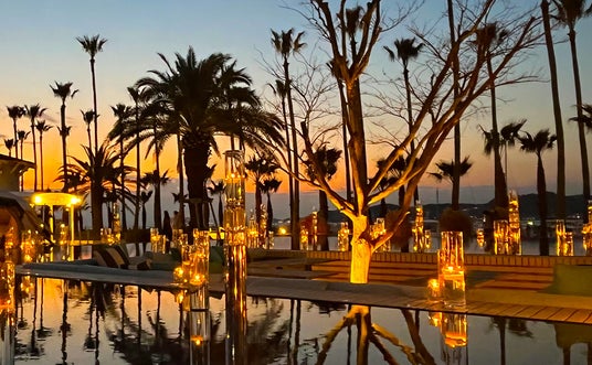 美しいサンセットから夜にかけて、水盤一面にキャンドルを並べ、煌めく優しい灯りで彩ります。水面にリフレクションする幻想的な光に包まれながらお食事をお愉しみいただけます。