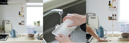 「tatecco(タテッコ)」の縦突っ張り棒はわずか約3cmのすき間があれば設置でき、アクセサリーの高さも調節可能なため、狭いキッチンでも日当たりのいい場所でスペースを圧迫せずに豆苗の再生栽培ができます。また、アクセサリーパーツは水洗いも可能で、容器を直置きせず、浮かせて栽培することができ、お掃除も簡単。容器の底のぬめりやカビが発生しづらく、清潔に保つことができます。