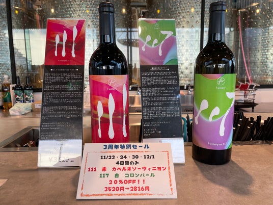 f winery[エフワイナリー]は2024年11月19日に、f winery stand(カフェ&バー)オープン3周年を迎えました。3周年を記念して、「f winery 111 カベルネ・ソーヴィニヨン」と、「f winery 117 コロンバール」のボトルを20%オフで販売します。11月23日(土)、24日(日)、11月30日(土)、12月1日(日)の4日間限定です。