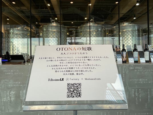 フェリシモは、約560名1,200首を集めた『OTONA短歌』の入賞作品の発表展示会を11月23日(土)~24日(日) 、30日(土)~12月1日(日) の4日間、神戸港目前の都市型ワイナリー「f winery[エフワイナリー]」を会場に開催します。短歌短歌は、それぞれの作品イメージに合うフォントを、Morisawa Fontsを運営する株式会社モリサワが選び、フォントで印刷をし展示してあり、フォントによって大人ゴコロを詠う『OTONA短歌』のインスピレーションをふくらませます。入選作品10点と、約560名1,200点の応募作品からほぼ全ての短歌を全26種類のフォントを用いて展示しています。初日11月23日(土)18:00から20:00には、短歌の審査員を務めた石田香織さんを招いて短歌を一緒に鑑賞する、カジュアルなスタイルの会が催されます。