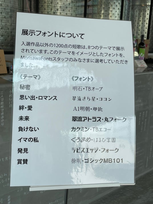 日常の生活の中で、心動く瞬間やドラマのような一瞬を詠むことで、過去を振り返ったり、未来を夢見たり、いくつになってもきらめく大人たちの素敵な言葉は見ているだけできっと誰かの心も熱くするはず。「フェリシモLX[ルクス]」が募集し集まった短歌を8つのイメージに分け、入選作品10点と、約560名1,200首のほとんどを、作品それぞれのイメージに合ったMorisawa Fontsで展示。