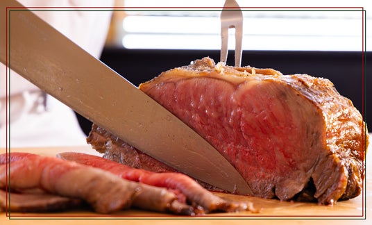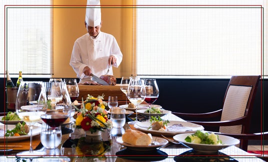 - テーブルの目前でスライスされるローストビーフ、その瞬間の芳醇な風味と上質な柔らかさをご堪能ください -