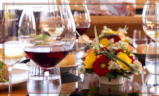 ご希望に応じて、テーブルには華やかなアレンジメントの花々を飾ります。空間に彩りを加え、ひとつひとつの瞬間を心に残る特別なひとときに仕上げます。