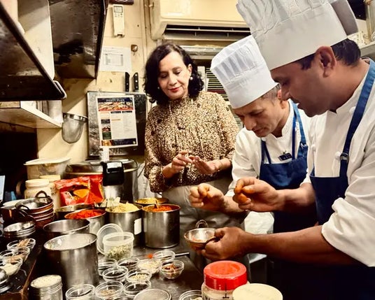 子育てが落ち着いた頃、家に人を招き手作りのインド料理をふるまったことをきっかけにレストラン経営の道に。