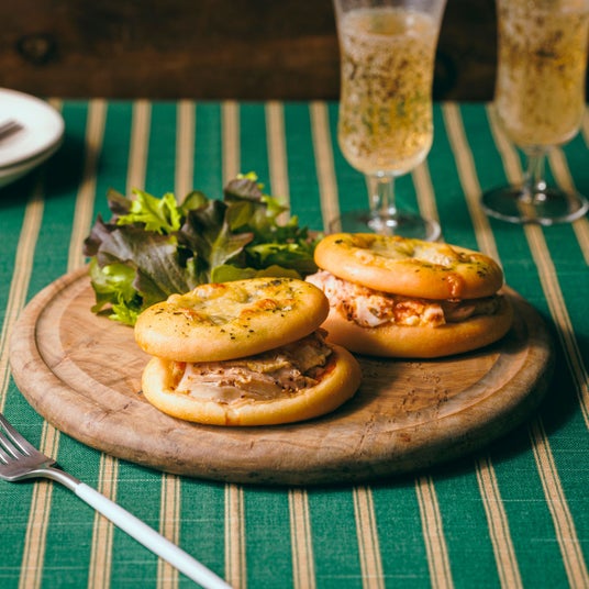 トマト入りのタルタルソースとチキンをもっちりとした生地で挟みました。トッピングのバジルソースで爽やかさをプラスした、食べ応えがありつつさっぱりとしたチキンパニーニです。