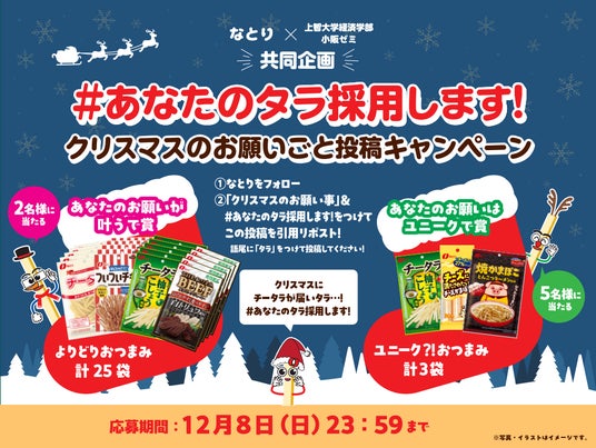 株式会社なとり(本社:東京都北区 会長兼社長:名取三郎、以下当社)は、上智大学(東京都千代田区、学長:曄道 佳明)の経済学部・小阪玄次郎講師のゼミ(以下 上智大学小阪ゼミ)と共同で企画をした、X(旧Twitter)キャンペーン「#あなたのタラ採用します!クリスマスのお願いごと投稿キャンペーン」を、なとり公式Xアカウントにて実施します。