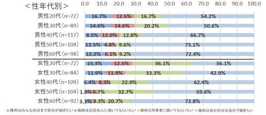 「焼肉に行くならどの方式?」という質問では、「個別注文派」が49.0%と半数近い結果に。また「自分で焼くか、焼いてもらうか」では、「自分の分は自分で焼きたい」が支持を集めました。性年代別では男性50代(73.1%)、60代(72.4%)が7割を超え、女性も40代(62.4%)、60代(72.8%)が高めという結果に。一方、「同席者に焼いてもらいたい」が最も高かったのは女性20代で36.1%でした。