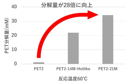 「PET2-14M-Hotlike」を基盤に酵素の機能を保つために必要な熱安定性とPET分解の活性をさらに向上させる「PET2-21M」の作製に成功しました。ペットボトルの検証において、反応温度60度でPETを分解する量が、改変前の酵素「PET2」と比較し28倍に向上することを確認しました。