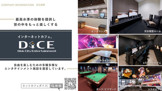 「DiCE」 は、2000 年より関東を中心に展開しているインターネットカフェです。高級感や清潔感などから、多くの女性のお客様にもご好評を得ています。豊富な雑誌・コミック、フリードリンクに加え、ソフトクリームに関しては「ソフトクリームに本気すぎるネットカフェ」として毎週違う味の提供や、他社とのコラボも行っています。また、グループ利用に最適な完全個室の VIPルームに加え、ダーツ・カラオケ・ビリヤードそして e スポーツ等のアミューズメントコンテンツもお楽しみいただけます。「暇をつぶす」ネットカフェから「時間を作って通いたい」ネットカフェに。最高水準の体験を提供し、世の中をもっと楽しくするネットカフェです。