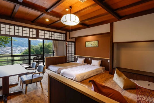 窓際に愛犬専用スペースを備えた、ウッドデッキ付きの客室。ここでしか撮影できない愛犬フォトスポット付きです。
