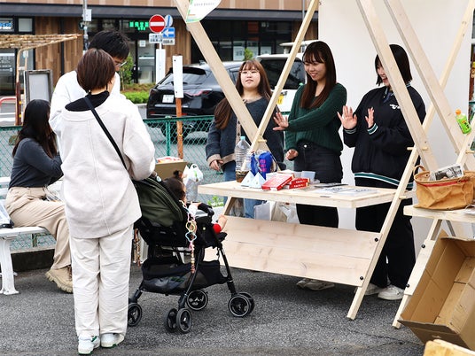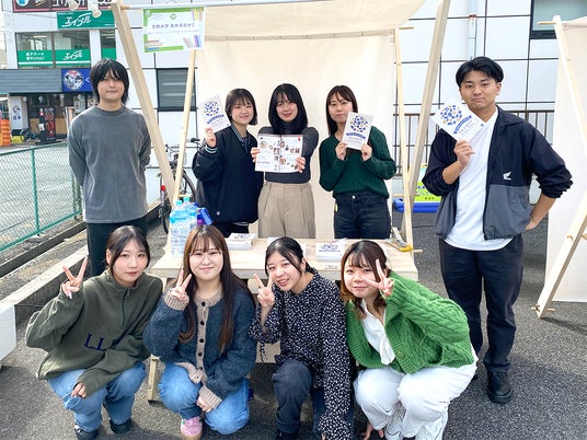 本誌は11月28日(木)に刊行されますが、11月16日(土)に谷塚駅西口地区まちづくり用地で開催された「本と楽しむマルシェエキマエ谷塚」において先行してお披露目され、青木洋高ゼミナールの学生がブースを出店しました。冊子を販売するとともにお茶を配る等、地域の方達との交流を深めました。