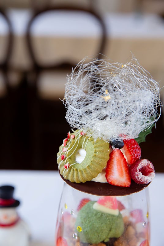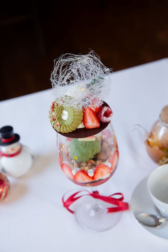ヨーグルトシャンティに苺のムース、ピスタチオアイスと濃厚テリーヌショコラ、苺のコンポートとシャンパンジュレ!旧ムーア邸パティシエが贈るこだわりのクリスマスパフェ