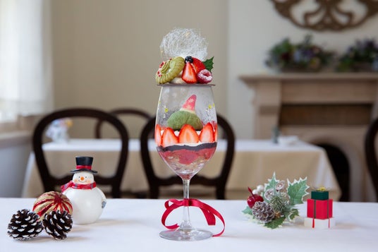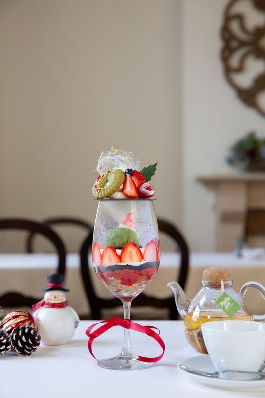 この度、北野異人館 旧ムーア邸では、クリスマス期間限定の国産いちごとショコラのブールアネージュパフェ(ドリンク付き)を販売します。