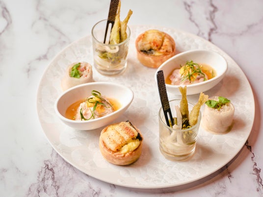 鰻とゆり根のキッシュ、白子燻製ポン酢、ワカサギと冬野菜のエスカベッシュ、蟹の生春巻き