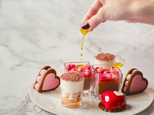 ハート型の苺スイーツに、オリーブオイルを注いで食べるユニークなプリンも登場!