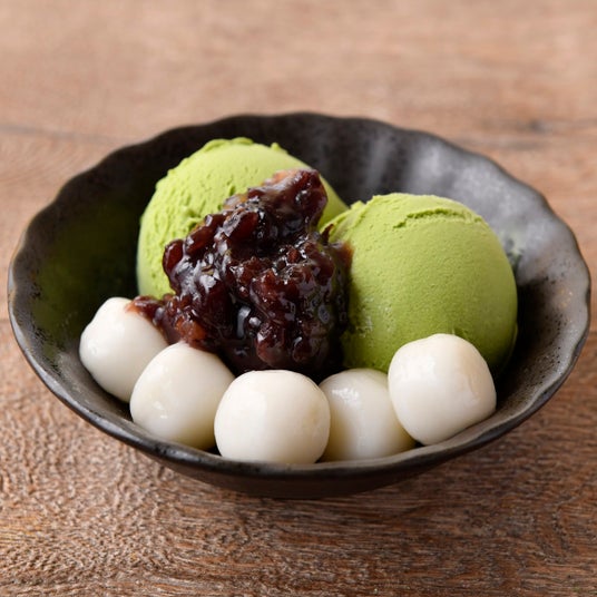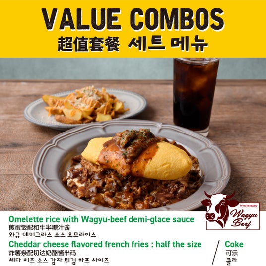 看板メニュー「デミグラスソースのオムライス」と新メニュー「黒毛和牛デミグラスソースのオムライスにポテトとドリンクがセットになった全4種。単品でご注文いただくよりお得に、ボリューム感あるおいしいセットとなっております!スイーツまで楽しみたい方には「抹茶白玉アイス ~あずき添え~」の追加メニューもおすすめです。