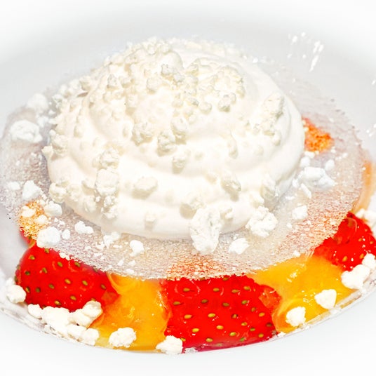 苺のコンポートと柚子のジュレをベースに、中央にはオリーブオイルのムースアイスとピスタチオパルフェを敷き、オパリーヌの上にブリアサバランのムースをトッピングした、初霜や淡雪をイメージした繊細なデザートです。