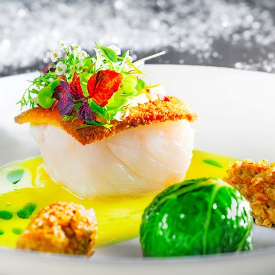 はんぺんを巻込んだヒラメをしっとりと蒸しあげてから、香ばしく焼き上げました。貝だしをベースにしたソースと共に、麦のリゾットを添えています。